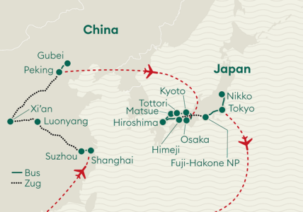 Begeben Sie sich auf eine Reise zu den faszinierendsten Zielen Asiens. Erleben Sie China und Japan in all ihrer Vielfalt. Diese Route führt Sie durch das historische und moderne China mit seinen Kulturschätzen und Metropolen und öffnet Ihnen die Tore zu Japans Tradition, Kultur und Innovation.