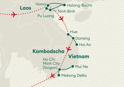 Von den geschäftigen Gassen Hanois über die majestätische Ruhe der Halong Bucht bis zur grünen Reiskammer im Mekong-Delta: freuen Sie sich auf unvergessliche kulinarische Highlights, wertvolle Einblicke in Vietnams reiche Kultur, herzliche Gastfreundschaft und die Gelegenheit, traditionelle Handwerkskünste hautnah zu erleben.