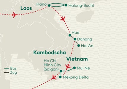 Erleben Sie das facettenreiche Vietnam: Von der lebhaften Hauptstadt Hanoi über die malerische Halong-Bucht bis nach Ho-Chi-Minh-City. Unterwegs entdecken Sie Hoi Ans charmante Altstadt, fahren mit dem Zug über den legendären Wolkenpass und erkunden das Mekong-Delta – eine Reise voller Kultur, Landschaft und Begegnungen.